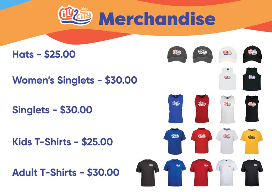 Our official City2City merchandise including t-shirts and singlets are now available. Please note that merchandise is NOT included in the cost of your registration.