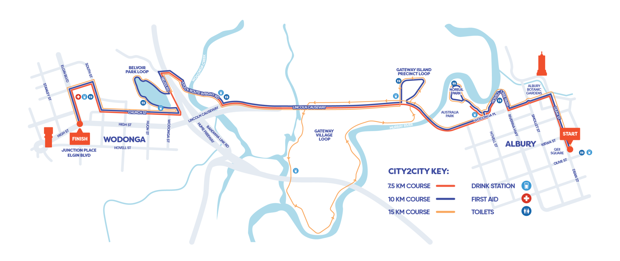 All events kick off on Dean Street, Albury at QEII Square, winding through the streets you know and love. Spot Wodonga Place, Lincoln Causeway, Sumsion Gardens, South St and Elgin Boulevard and finish with good vibes in our event village in Wodonga’s Junction Place.